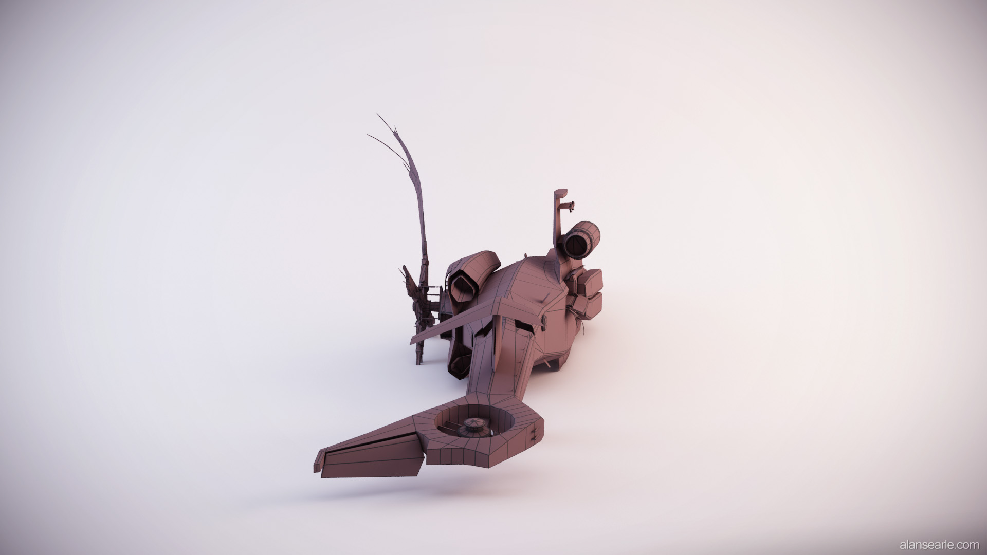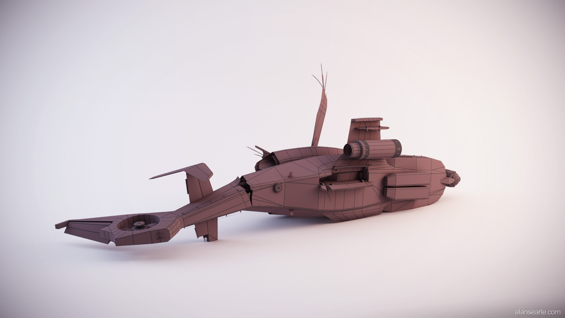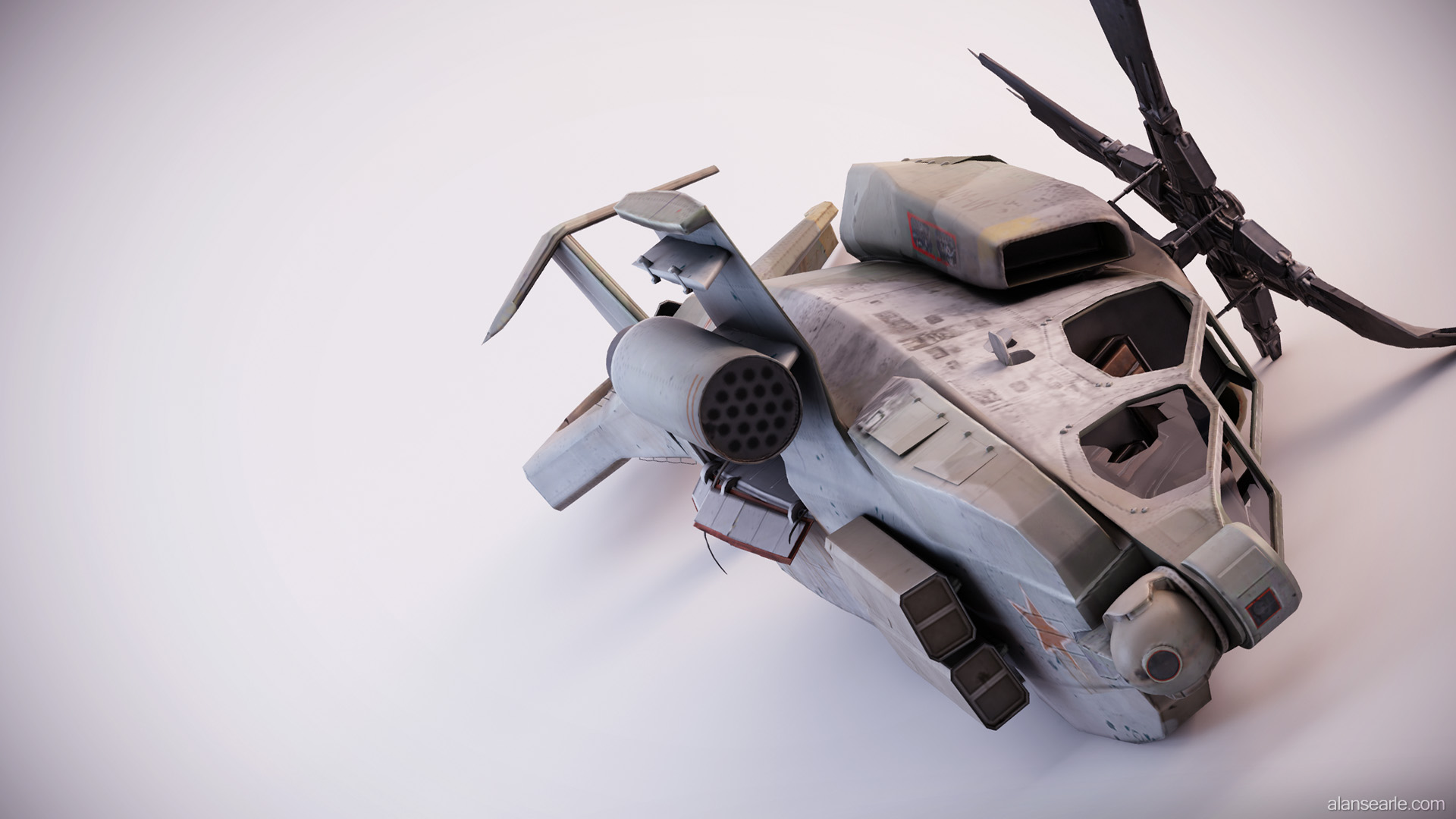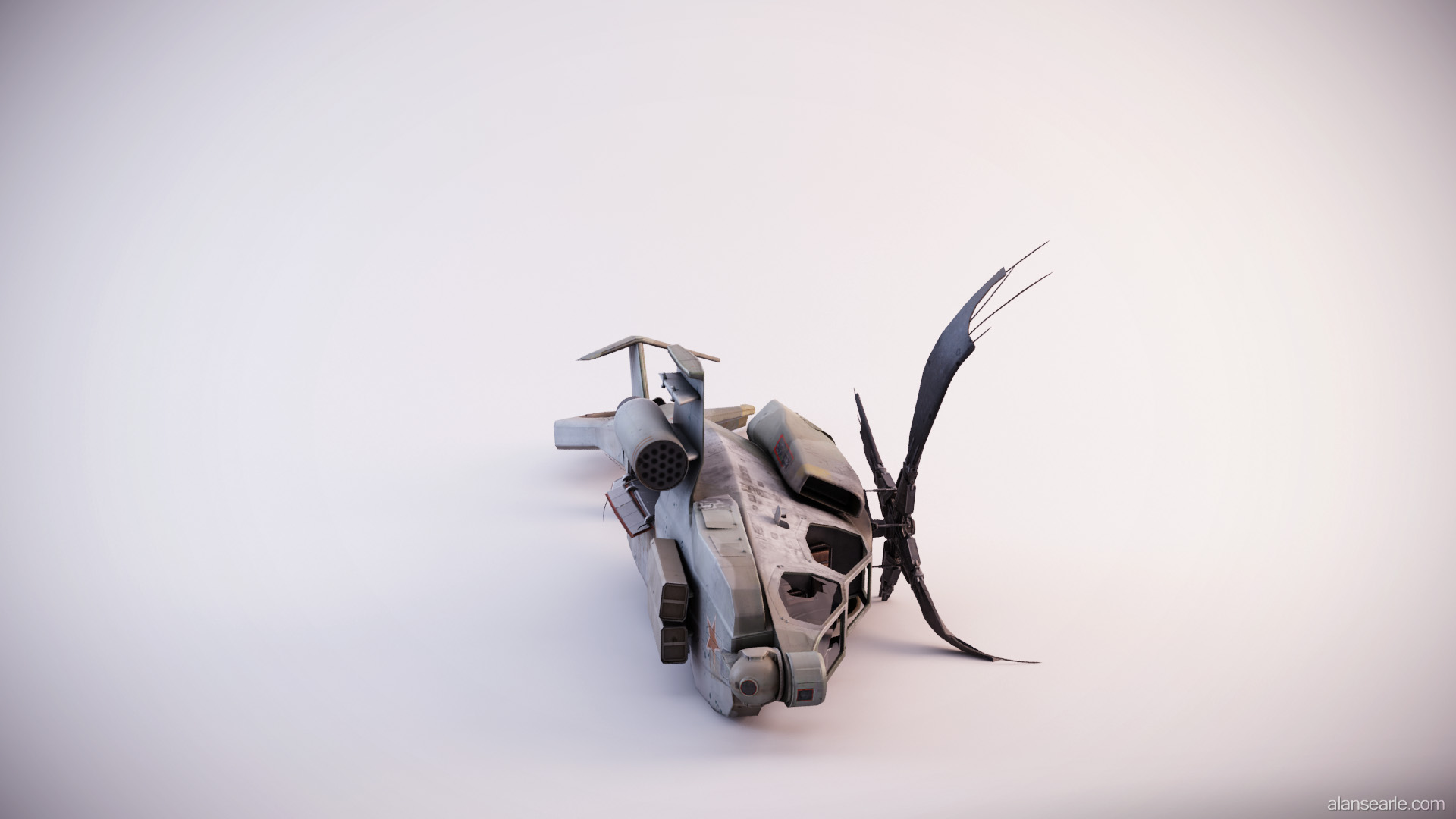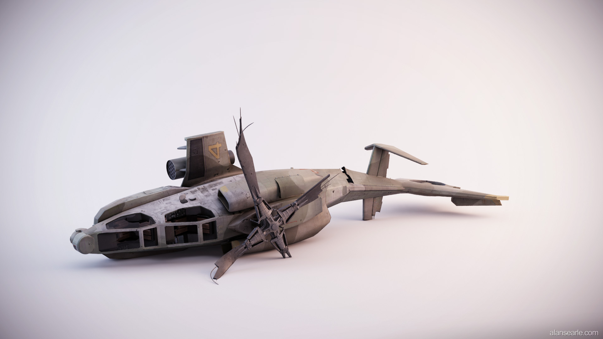 This model was a feature piece of cover in the PS3 first person shooter "No Man's Land", found within PlayStation©Home. Due to the design of the game, the helicopter had to have fairly flat vertical surfaces to hide behind, which is one of the reasons it is lying on its side. Many different attack helicopters were used as inspiration, however the primary shape is a mix between the RAH-66 Comanche Stealth Helicopter and the AH-64 Apache.